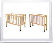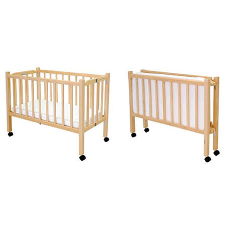 Cuna de madera - Dimensiones: Largo 1.15 mt. x Ancho / 0.60 mt. x Altura / 0.86 mt. - Barníz transparente no tóxico, estructura fabricada en madera de pino de 1ª, espacio entre barrotes de 9 cm, 4 ruedas tipo yoyo de 2". Colchón de Hule Espuma de 2" cubierto de vinil